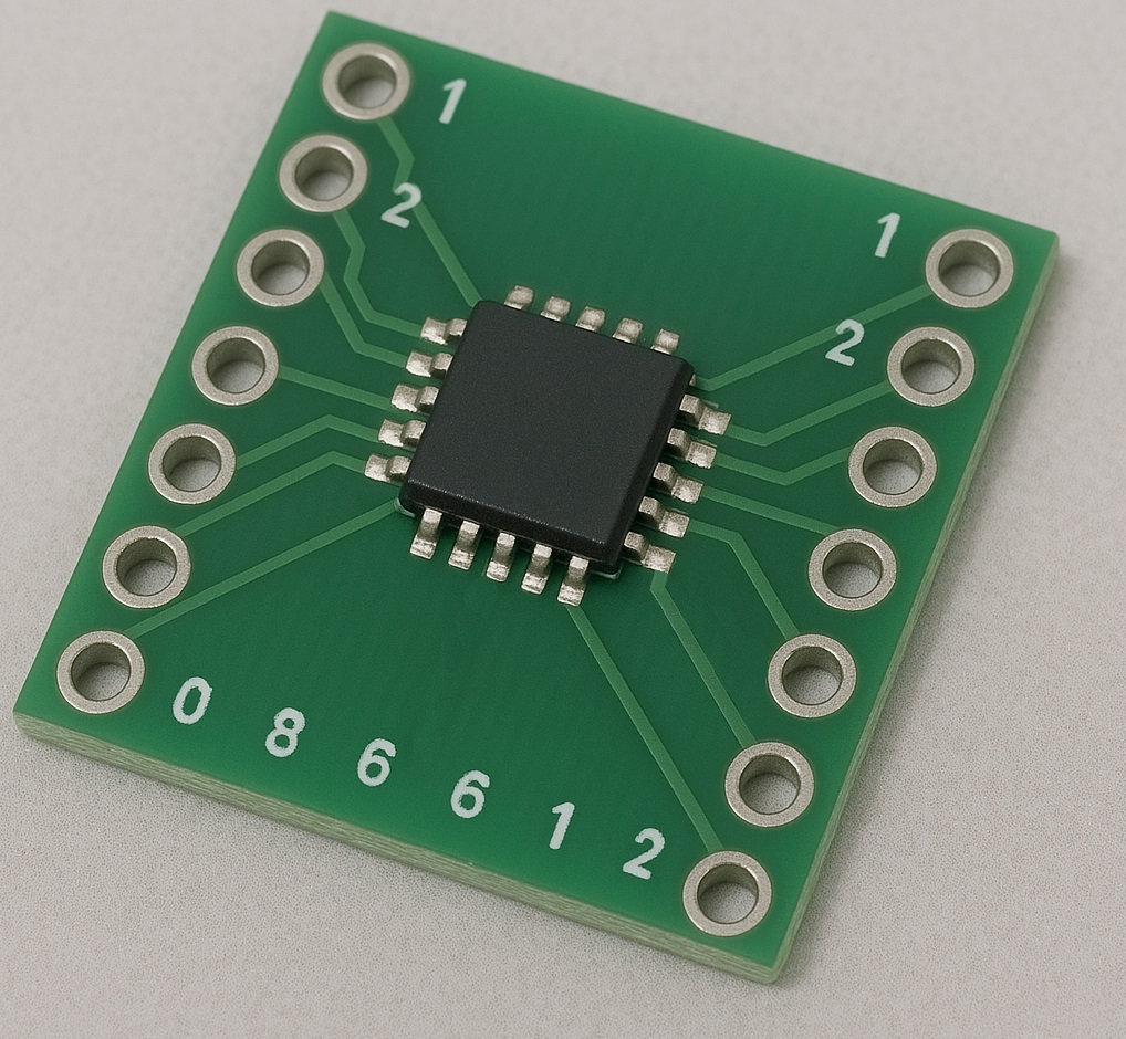 特に、ブレッドボードやユニバーサル基板で小型のICを使用したい場合は、職人技のような細かいジャンパ線を飛ばさないといけなくなり非常に難儀します。 そこでよく利用されるのが「変換基板」です。 変換基板には部品のパッドが用意されており、そこに対象の部品を実装します。 そこから配線が伸びて、ピンヘッダーなどを実装できるスルーホールに接続されています。 このランドは通常2.54mmピッチなど、ブレッドボードやユニバーサル基板に一致する間隔になっています。
