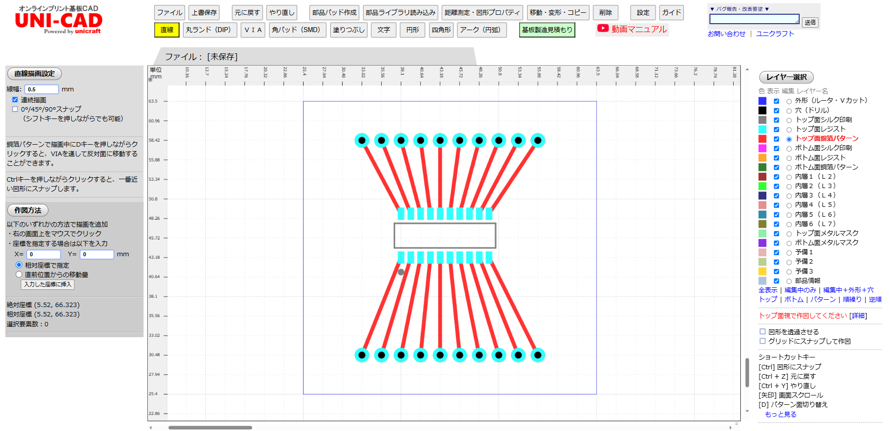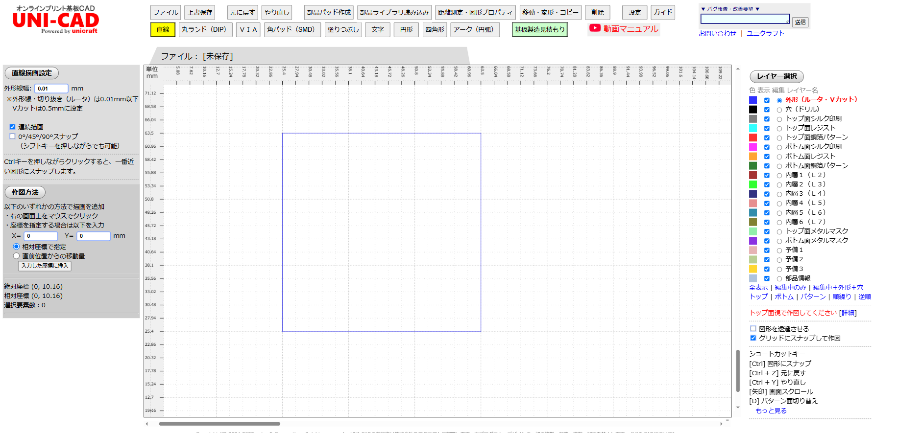 UNI-CADの使い方をなんとなくわかっていただいたところで、実際に変換基板を設計する操作をご説明します。 まずは、基板外形線を引きます。 機能:直線 レイヤー:外形 後からでも変更できますので、だいたいのサイズで結構です。