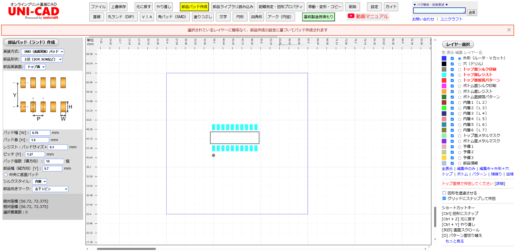 次に部品(ICなど)を中央に配置します。 機能:部品パッド作成 レイヤー:選択不要(自動選択されます) 部品のデータシートを見ながらパッドサイズやピッチなどを画面左で設定します。 画面中央の作図エリアをクリックすると部品が配置されます。 ※KiCad形式のライブラリを「部品ライブラリ読み込み」機能で取り込むことも可能です。