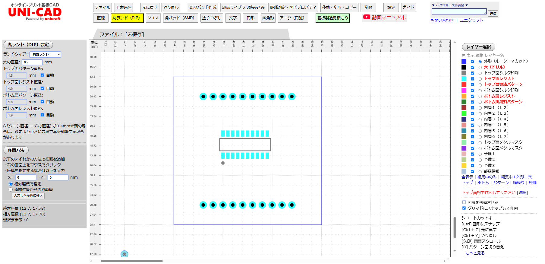 変換先のランドを配置します。 機能:丸ランド レイヤー:選択不要(自動選択されます) ピンヘッダ等のデータシートを見ながら穴径を画面左で設定します。 直径1mmの穴であればほとんどのピンヘッダーで対応できると思います。 製造誤差を考慮して、必ずピンヘッダーの端子よりひと回り大きい穴径としてください。 また、ピンヘッダーの端子断面が四角形の場合は、対角の寸法よりて穴径を大きくしないといけないことにご注意ください。(普通に考えると当たり前ですが、意外と間違いやすいです) ランドタイプは「両面ランド」を選択します。 2.54mmピッチであればUNI-CADのデフォルトのグリッドサイズですので変更する必要はありません。 それ以外のピッチの場合は、「設定」ボタンをクリックしてグリッドサイズを変更しておきます。 また、「丸ランド」機能ではなく、「部品パッド作成」機能で作成してもよいです。