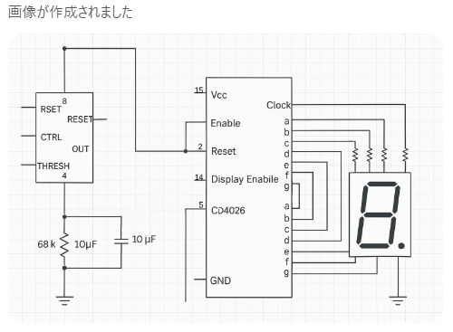 以下は、「7セグメントLEDに0〜9までの数字を1秒ごとに表示する」ための基本的な回路例です。マイコンを使わずにカウンタIC(例:CD4026)と7セグメントLEDで構成する回路になります。