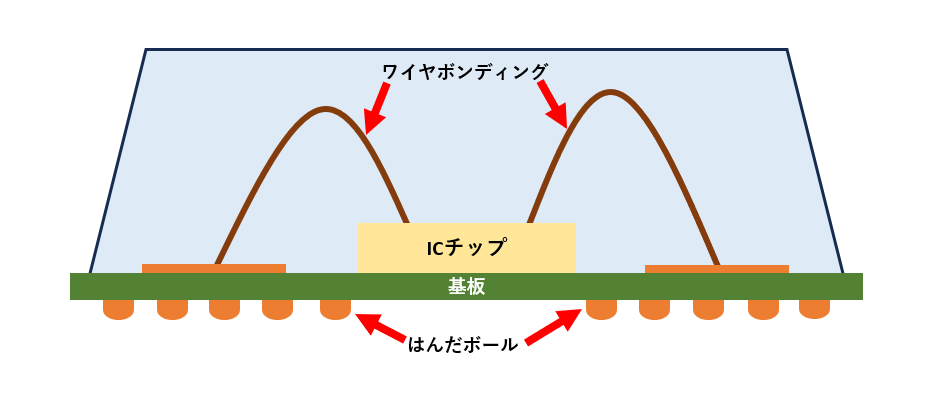 ・ICチップ:パッケージ内に搭載される半導体チップ。 ・サブストレート(基板):チップと外部の接続端子(はんだボール)を結ぶ役割。 ・ワイヤボンディング / フリップチップ接続:チップと基板を接続する方法。 ワイヤボンディングの場合は金線などで接続し、フリップチップ方式では直接はんだバンプで接続。 ・はんだボール:基板に実装するための接続端子。 BGAはこれらの要素が組み合わさることで、高密度な配線と安定した接続を実現しています。 ・BGA断面図(ワイヤボンディング)