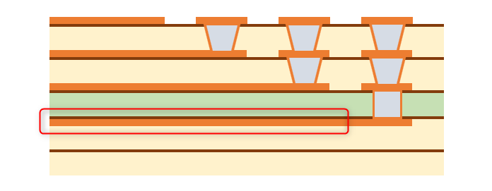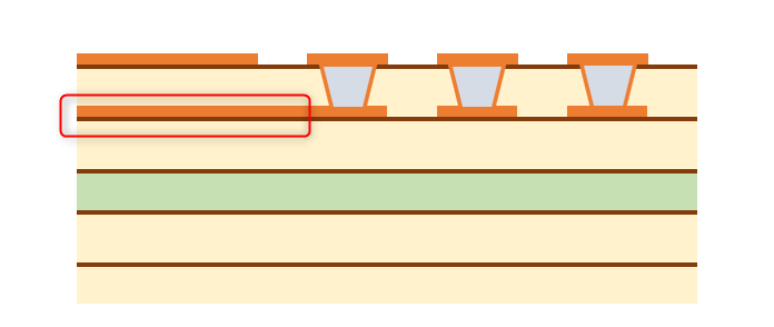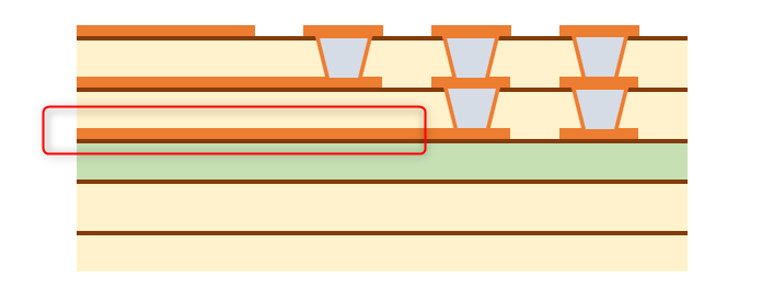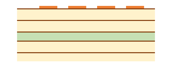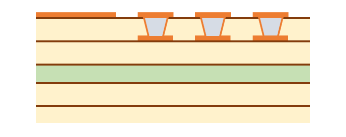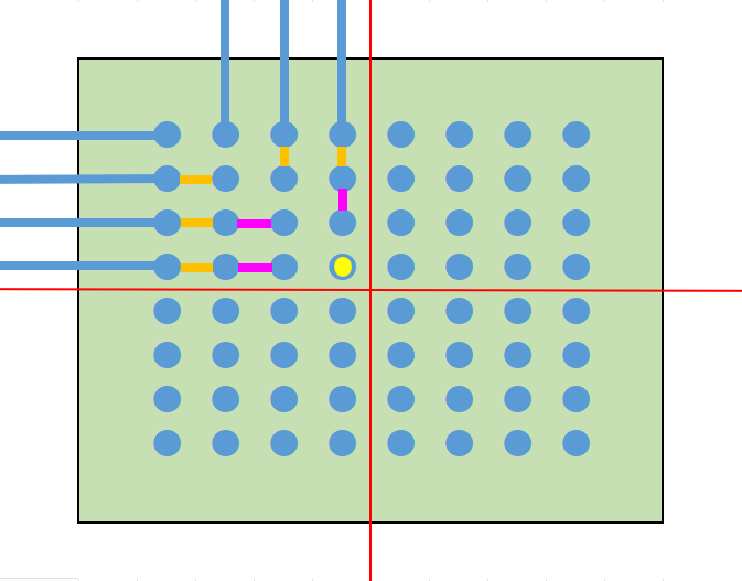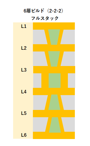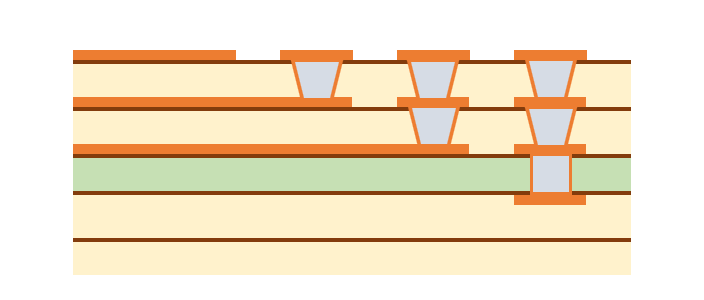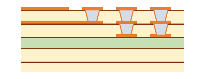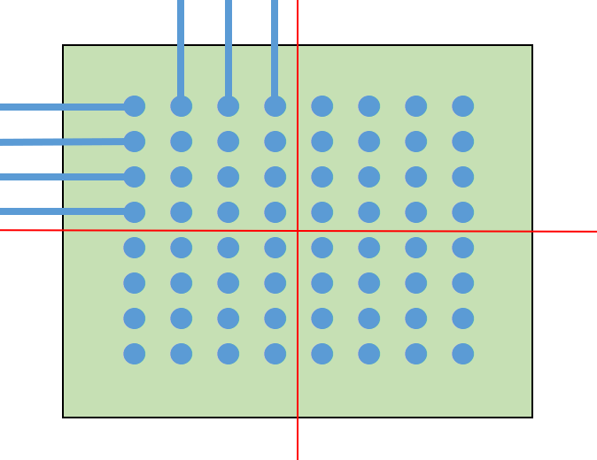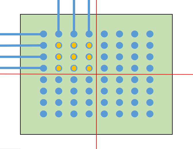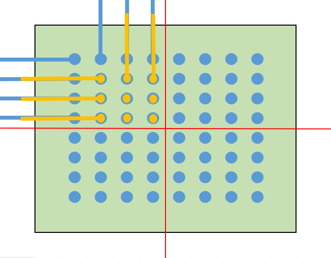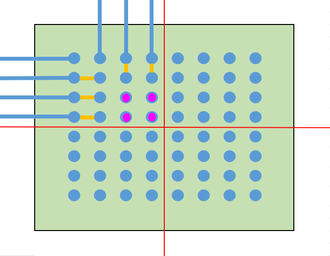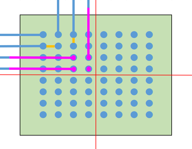 まず、一番簡単な配線の引き出し方法は、単純にパッド間に配線を通すことです。 また、パッド間のピッチが広いBGAであれば、パッドの近くにVIAを打って他の層で配線します。 これらの方法であれば一般的なスルーホール基板で設計できますので、基板を低コストで製造できます。 パッド間に配線が通せず、VIAを打つスペースもない場合は、特殊な基板を作る必要があります。 主に、パッドオンビア(Pad on VIA)またはビルドアップ基板が採用されます。 パッドオンビアはBGAパッドの真下にVIA(貫通)を通しますので、パッド間にスペースがなくても採用することができます。 ただし、VIAが基板の表から裏まで貫通しますので、列数が多いBGAでは配線を引ききれないことがあります。 その場合はビルドアップ基板を採用します。 ここからは、ビルドアップ設計での配線引き出しを紹介いたします。 ★6層ビルド 2-2-2 フルスタックで配線を引き出す ビルド基板は層構成で価格や納期、設計難易度が大きく変わります。 中でもフルスタックは、ビアがまっすぐに並んでいて製造難易度が上がるため、価格が他の層構成と比べて高くなりがちです。 ただスペースは抑えられますので、設計難易度は比較的易しいです。今回はこれを使ってBGA配線引き出しを行います。 BGAを4等分する BGAの中心から4つに分割します。 断面図 1列目を引き出す 表層には、パターンを阻む部品パッドがありませんので、ここは問題なく引き出せます。 1列目以外のピンにレーザービアを打つ 2列目以降は前列のパッドが邪魔して、表層ではパターンを引き出せません。 そこで1-2層用の非貫通レーザービアを打ちます。 2列目パターンを引き出す 1-2層にレーザービアを打ったことで、2列目は2層でパターンを引き出せます。 3列以降のピンにレーザービアを打つ 3列目以降もやはり前列のビアが邪魔してパターンが引き出せないため、 2-3層の非貫通レーザービアを打ちます。 3列目を引き出す 3列目は、3層でパターンを引き出します。 4列目のピンにベリードビアを打つ 4列目も前列のビアが邪魔でパターンを引き出せないため、 非貫通のベリードビア(内層間のみを繋ぐビア)を打ちます。 4列目を引き出す 4列目は、4層でパターンを引き出します。 この作業を4分割した他のエリアで行うことで、すべて配線が引き出せます。