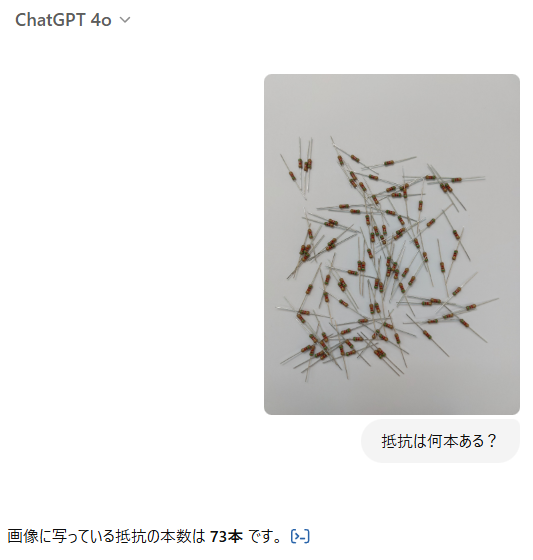 精度がどの程度かはわかりませんが、バラ部品であれば有効な方法です。 通常は部品カウント専用のAIを使いますが、今回は汎用のAI(Chat GPT)で試してみました。 96本の抵抗をばらまいた画像を読み込ませます。 部品同士が重なっているのが良くないようです。 部品が重ならないようにしてみます。 ▲試行錯誤すること約10分、ようやく正しい個数が表示されました。 単純に部品同士を離すだけでは検出精度が悪く、AIと対話しながら閾値や検出条件を調整しました。 (ひとつひとつ数えた方が早かった・・・) 円筒形の抵抗は転がってしまうので、部品が重ならないように並べるのが大変でした。 部品の形状によっては有効な方法かもしれません。 今後のAIの発展に期待です。