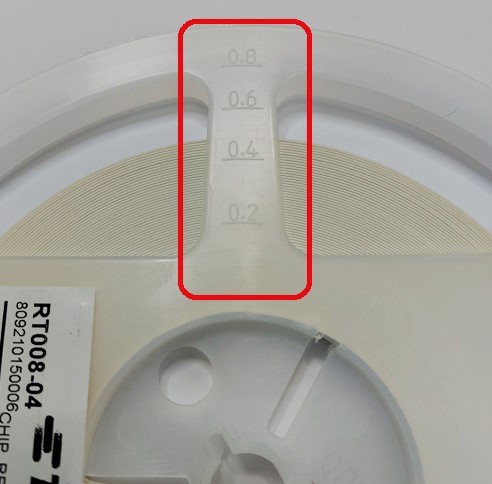 ![]() 部品メーカによっては写真のようにリールに目盛りを入れている場合があります。 これを使うことでおおよその残量を知ることができます。 ただし、1つ重要な注意点があります。 写真では0.2、0.4、0.6、0.8と目盛りが書かれていますが、これはリールを満タンまで巻いた数量に対する割合です。 写真の部品の場合、10,000個入りの新品状態で、0.5(50%)程度までしか巻かれていません。 例えば0.2の目盛りまで減った場合は、10000個×0.2÷0.5=4000個です。 安易に10000個×0.2=2000個と計算してはいけません。 ですので、新品で購入した時点で、どの目盛りの位置まで巻かれているか記録しておく(リールに目印を付けるなどする)必要があります。