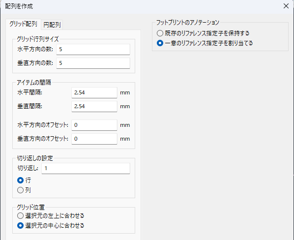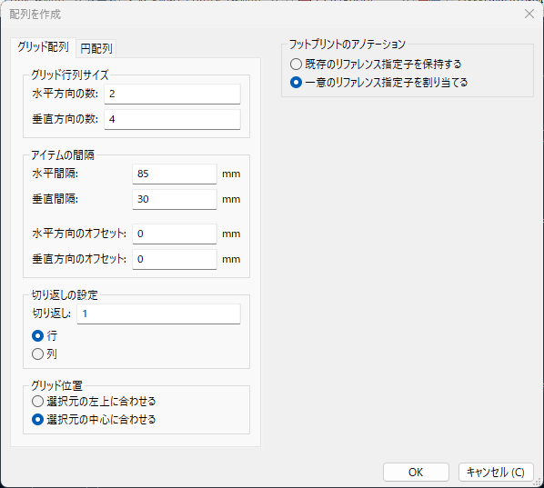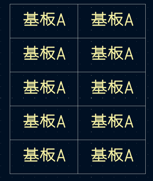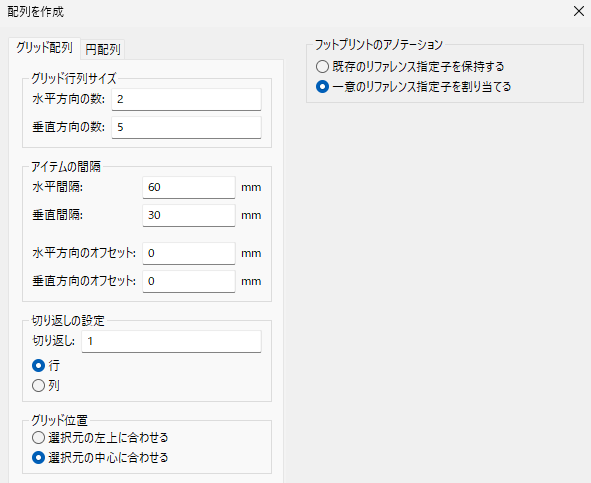 ![]() PCS全体を選択して、 ![]() 右クリックして「選択対象から作成」→「配列を作成」 ![]() そうするとこのような画面が出ます ![]() 今回は横に2pcs、縦に5pcsの10pcs/sheetの同種面付を行うので、 水平方向の数は2、垂直方向の数は5となります。 また、「アイテムの間隔」ですが、今回はVカットでpcs同士を分割しますので、 pcsのサイズ通りに水平間隔:60mm、垂直間隔:30mmを入力すると、pcs同士が綺麗にくっついたsheetが出来ます。 ![]() このようになります。捨て板や認識マークは必要に応じてsheetに付けていってください。 ![]() また、配列を作成の画面に「オフセット」とありますが、千鳥配置などを行いたい場合に設定すると入力した数値分ずらして配置してくれます。 水平方向のオフセット10mm ![]() ※ちなみにこの状態では縦方向のVカットが加工できないため基板製造はできません。 Vカットは基板の端から端まで突っ切る必要があります。途中で止めることはできません。 垂直方向のオフセット10mm ![]() ※この状態も横方向のVカットが加工できないため基板製造はできません。 千鳥の面付けの場合は、スリットの併用をご検討ください。