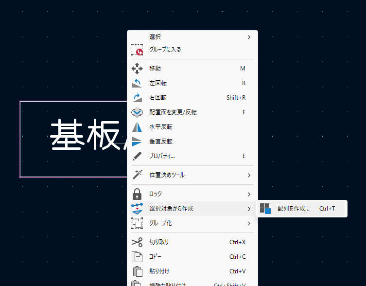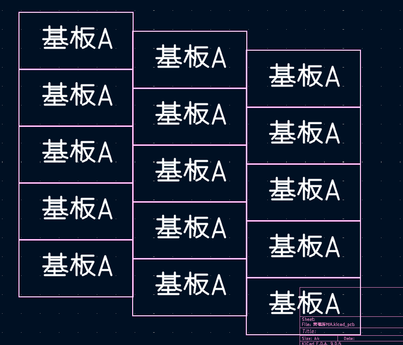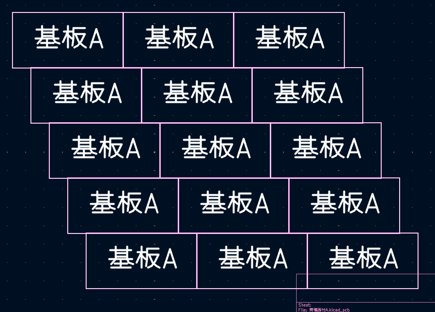 ![]() そして面付プロジェクトのPCBエディターを開いて、ここに前もって作っていた単pcsデータの基板Aと基板Bを追加します PCBエディターの左上、「ファイル」→「基板を追加」 ![]() 基板Aのkicadデータを選択して追加 ![]() 同じく「ファイル」→「基板を追加」で、基板Bのkicadデータを選択して追加 ![]() すると2種の単PCSデータが追加されました。 ![]() それらを面付しやすいようにに並べて、 ![]() グループ化します。 全体を選択して右クリック、「グループ化」→「アイテムをグループ化」 ![]() あとは配列を設定して、実行すると、 ![]() 異種面付が完了しました。 ![]() 面付については以下のページもご参照ください。 プリント基板の面付け方法のご紹介