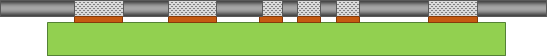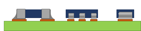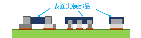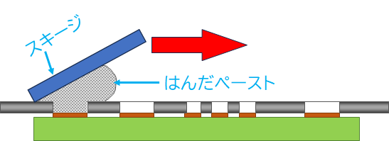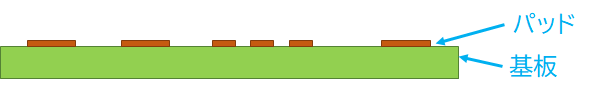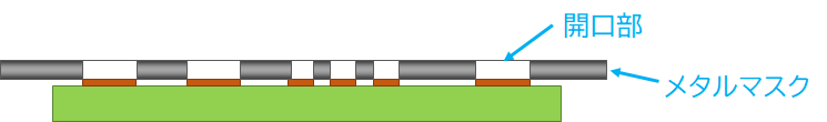 基板の断面図です。 ![]() 基板の上にメタルマスクを置きます。 メタルマスクの穴が、部品パッドの位置と一致していることが分かります。 ![]() はんだペーストをメタルマスクの穴に入れていきます。 はんだペースト(クリームはんだ)とは、はんだの粒子をフラックスで練りこんだものです。 ![]() はんだペーストを刷り終えた状態です。 ![]() メタルマスクを取ると、パッドの上だけにはんだペーストが残ります。 はんだペーストは粘度の高いクリームのため、メタルマスクを流れ落ちることはありません。 ![]() はんだペーストの上に部品を置きます。 はんだペーストは粘り気がありますので、置いた部品は簡単に動きません。 (軽い部品であれば裏返しても落ちません) ![]() リフロー炉で加熱するとはんだが溶けて実装完了です。 ![]()
