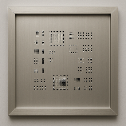 ▼メタルマスク写真 ![]() (表面実装部品のパッド部分に合わせて穴が開いています。) 部品実装で使うメタルマスクの厚さは通常0.1〜0.2mm程度ですので、そのままではペラペラで扱いにくいことがあります。 そのため、通常はアルミ枠を取り付けて、取り扱いしやすいようにします。 ![]()
