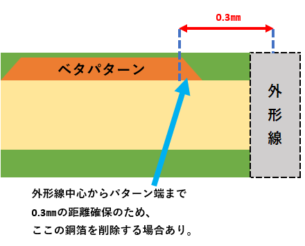 外形線中心からパターン端まで0.3o確保のため、 通常はCAM編集作業で外形から0.3mmの銅箔を削除して製造します。 ![]() ※上図で幅を持った外形線が描かれていますが、ガーバーデータの外形線(0.2mm程度の線幅で描かれることがある)を イメージしたものです。 実際は線幅の中央で外形加工(切断)されます。 また、細いパターンを外形線付近に並行に走らせる場合は、特にご注意ください。 微細な配線であれば距離0.5oに修正をお願いする場合もあります。 ![]() ご希望であれば基板端(外形線と接する位置)まで銅箔を残せます。 ただし基板端付近の銅箔にレジストが塗られず、銅箔が露出する可能性があります。 ![]() ちなみに、外形線とランドやパッドとの距離についても同じことが言えまして、 外形線中心とランド・パッド最小距離 0.3o となります。 ※小さいランド、パッドは距離0.5oを推奨します。 また、外形線とノンスルーホールとの距離については、 板厚と同程度の距離(板厚1.6oであれば距離1.6o)を推奨としておりますが、 実際には板厚、穴径、製造工場の能力などで変わってきます。 内容次第では最小距離0.3oでも製造可能でございます。 まずはお見積もりをご依頼いただければ、弊社にてデータを確認させていただき、 修正した方が良い箇所は、お知らせいたします。 ★外形線について、その他の注意事項はユニクラフトデザインルール 基板外形をご覧ください。