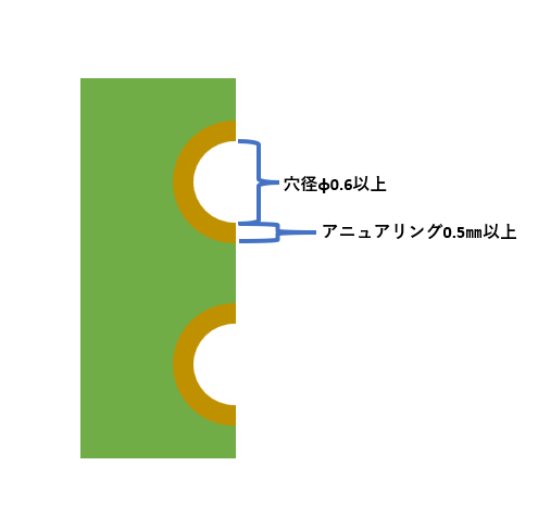 端面スルーホールは、まず通常のスルーホールを作り、最終的にルーター加工で半分を切り落とします。 Vカットスルーホールを切って端面スルーホールを作ることはできませんのでご注意ください。 以下の画像に有りますように、 穴径はφ0.6以上、アニュアリング幅は0.5o以上必要です。 (通常のスルーホールはアニュアリング幅0.2o以上必要) ![]() 以上、設計時の参考になれば幸いです。 何かご不明点あれば、いつでもお問い合わせください。