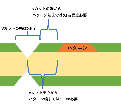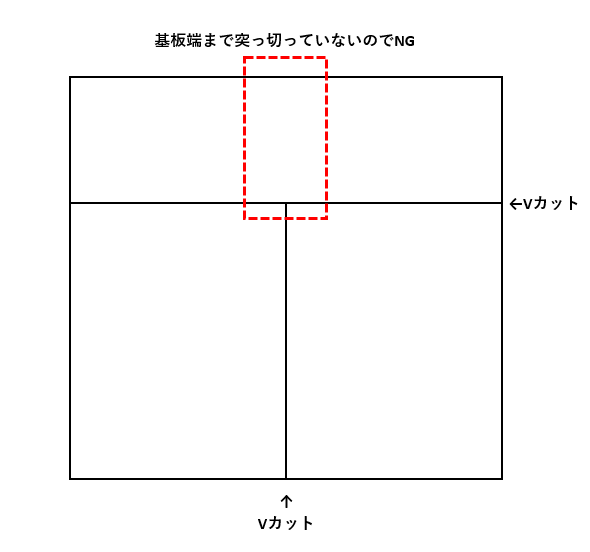 @ Vカット線とパターンの距離が近い Vカット線とパターンが近すぎると、分割時にパターンが削れる可能性があるので、 Vカットの中心からパターン端までは0.55mm以上の距離が必要です。(Vカット端から0.3mm程度) ![]() なお、Vカット付近に部品を配置される場合は、Vカットを割る際の応力で はんだクラックが発生する恐れがありますので、Vカットとパッドの距離は 十分確保されることをお勧めいたします。 A Vカット線が途中で止まっている(基板の端から端まで突っ切っていない) ![]() ★Vカットについて、その他の注意事項はユニクラフトデザインルール Vカットをご覧ください。