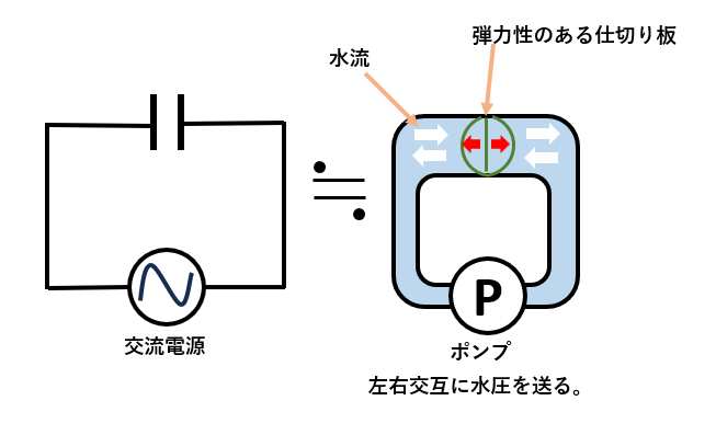 この膜の部分がコンデンサ、膜で仕切られた左右の水流は交流が流れる導線部に相当します。